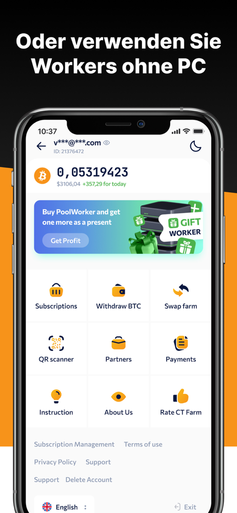 Mach mehr aus deinen Smartphone und eröffne dir mit CT Farm einen Weg zur einfachsten Möglichkeit, BTC zu verdienen! Mit einer intuitiven Benutzeroberfläche und einem leicht zu verwendenden Dashboard kannst du jede Aktion in wenigen Sekunden ausführen: Hardware kontrollieren, ihre Aufgaben neu planen, Benachrichtigungen einrichten und jederzeit gebührenfrei abheben – das ist all der Komfort, den du brauchst, in einer App!
