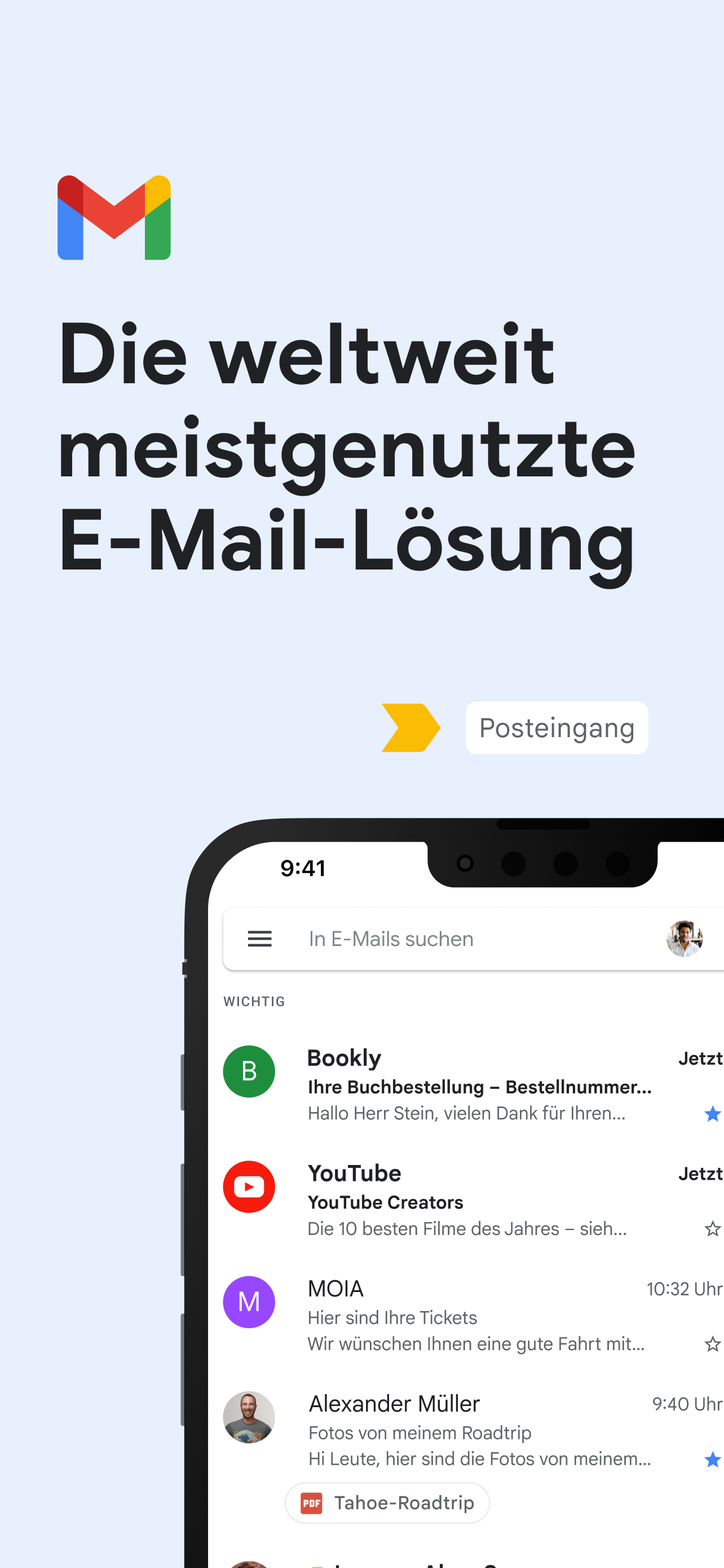 Mit der offiziellen Gmail App für Ihr iPhone oder iPad profitieren Sie von allen Vorteilen, die Gmail bietet: umfassende Sicherheit, Benachrichtigungen in Echtzeit, Unterstützung für mehrere Konten und die Suche im gesamten Posteingang.