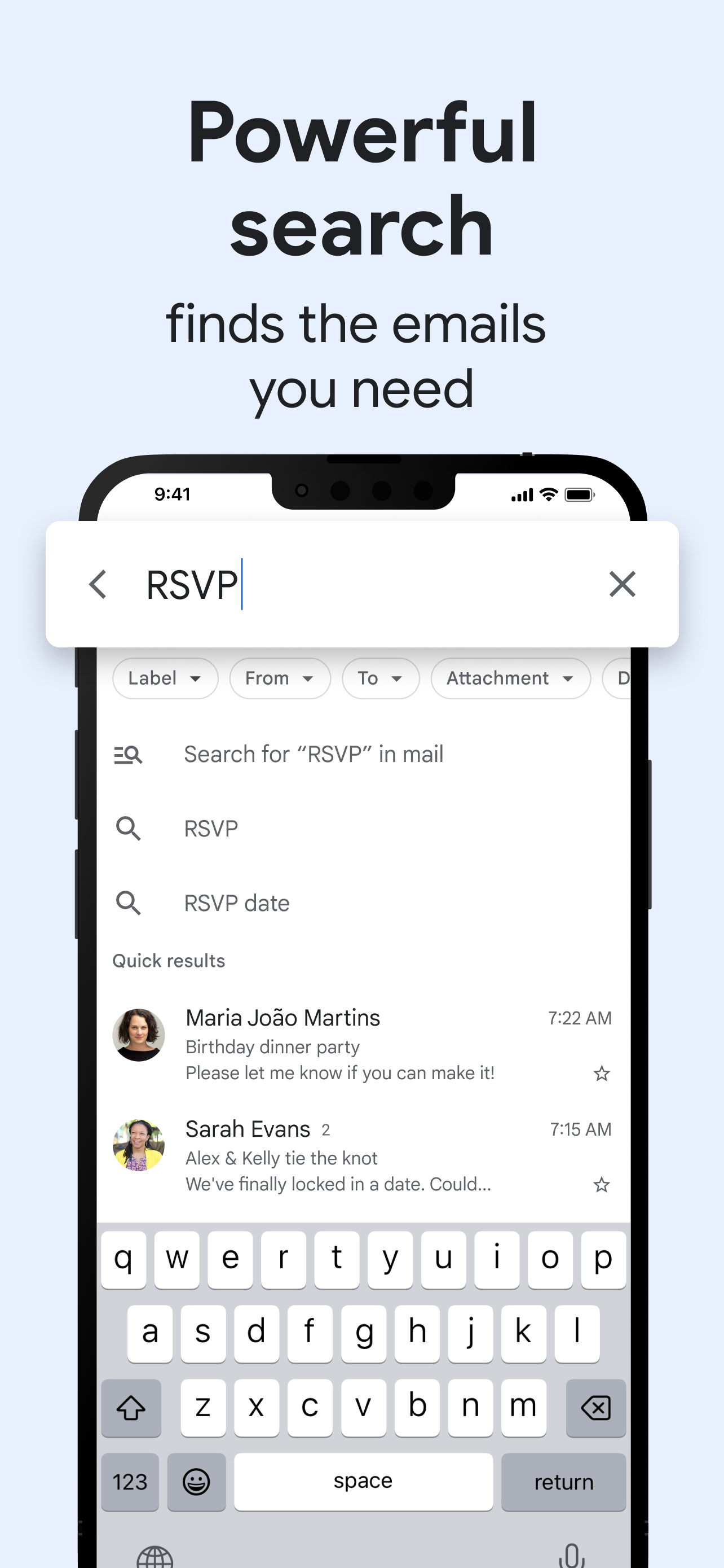 • Search your mail faster with instant results, predictions as you type, and spelling suggestions