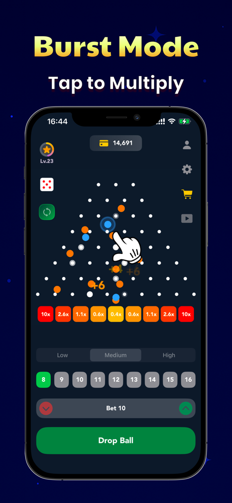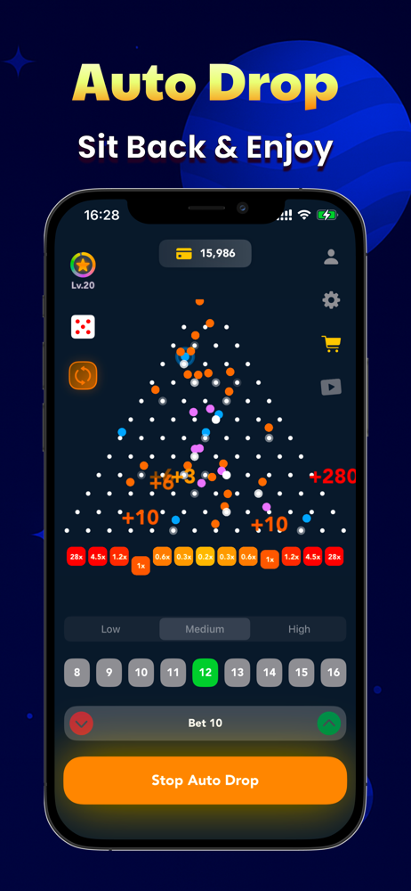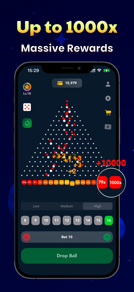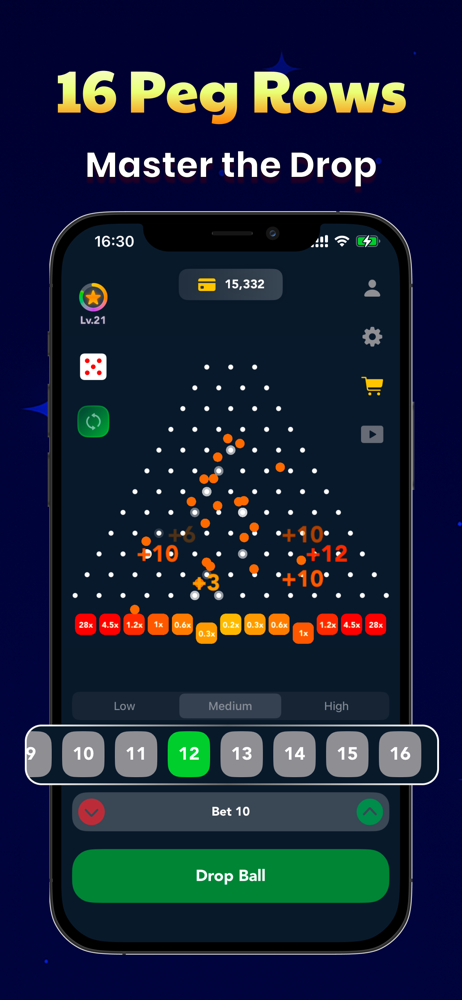 Guide your Plinko ball through 16 rows of authentic Pachinko pins. Trust your luck, enjoy thrilling suspense, and see if your stake pays off with each exciting bounce!