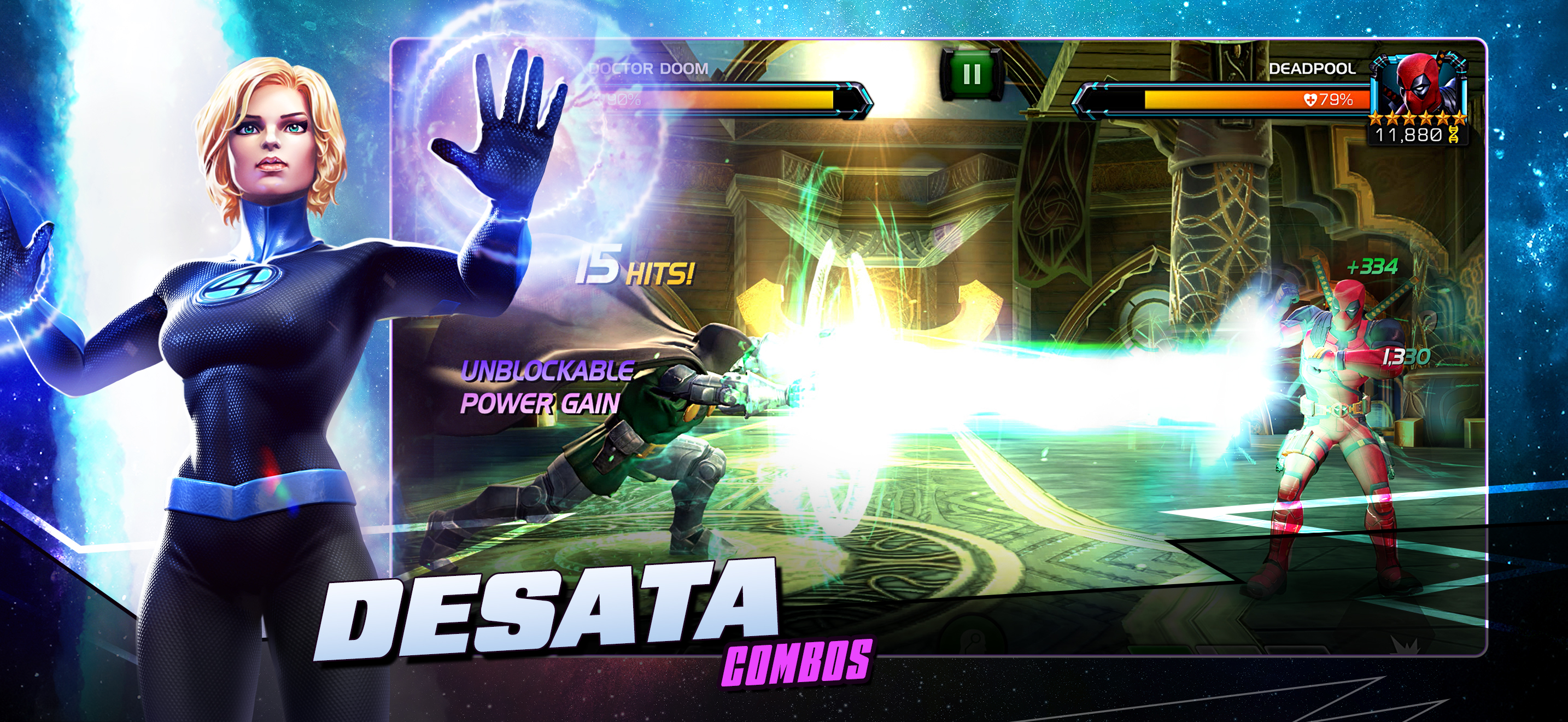 ¡Prepárate para una acción épica de lucha y combates contra tus superhéroes y supervillanos favoritos de Marvel en el enfrentamiento cósmico definitivo! ¡Spiderman, Iron man, Deadpool, Wolverine y muchos más esperan tu llamada a la batalla! ¡Reúne un equipo y comienza tu aventura para convertirte en el Campeón Marvel Definitivo!