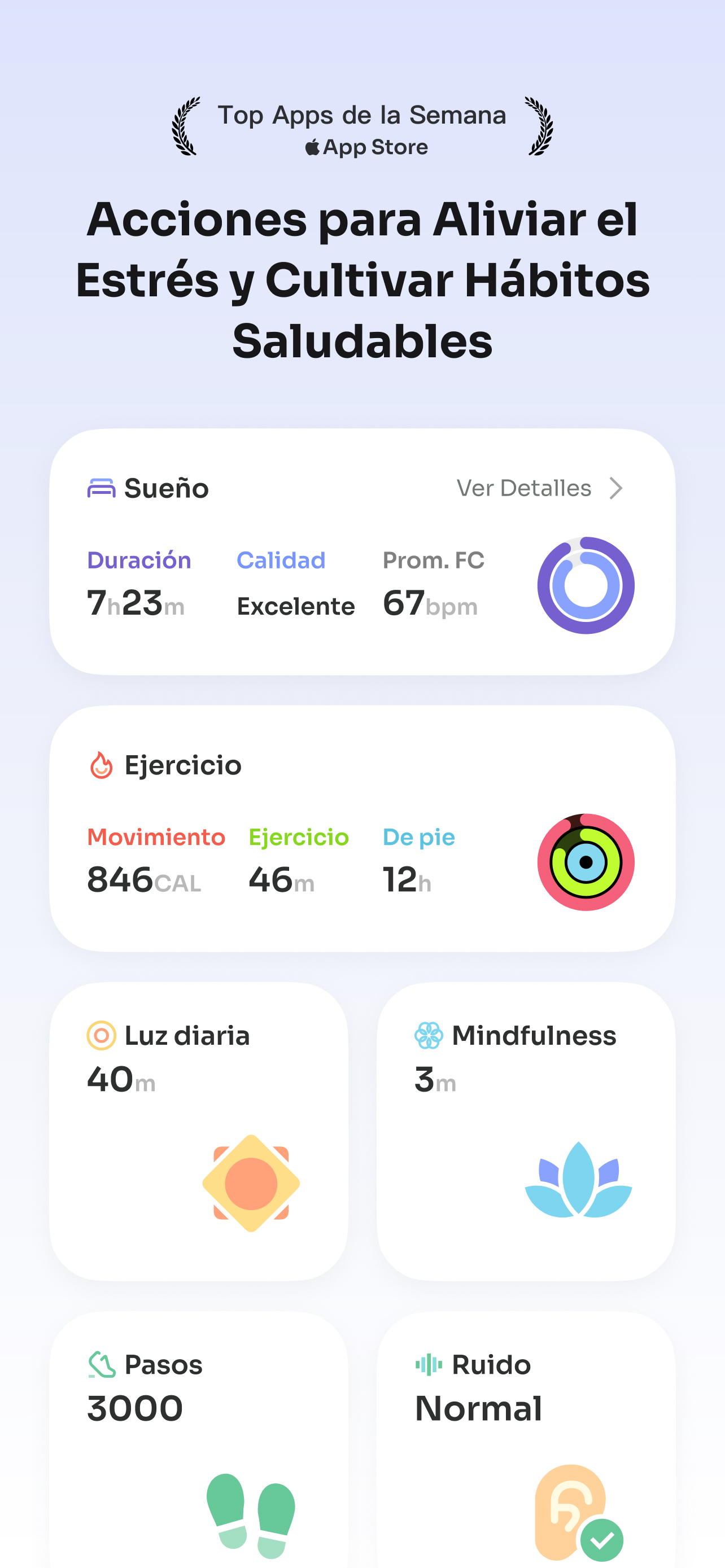 StressWatch utiliza los datos de tu Frecuencia Cardíaca en Reposo (FCR) y la Variabilidad de la Frecuencia Cardíaca (VFC) obtenidos de Apple Salud.