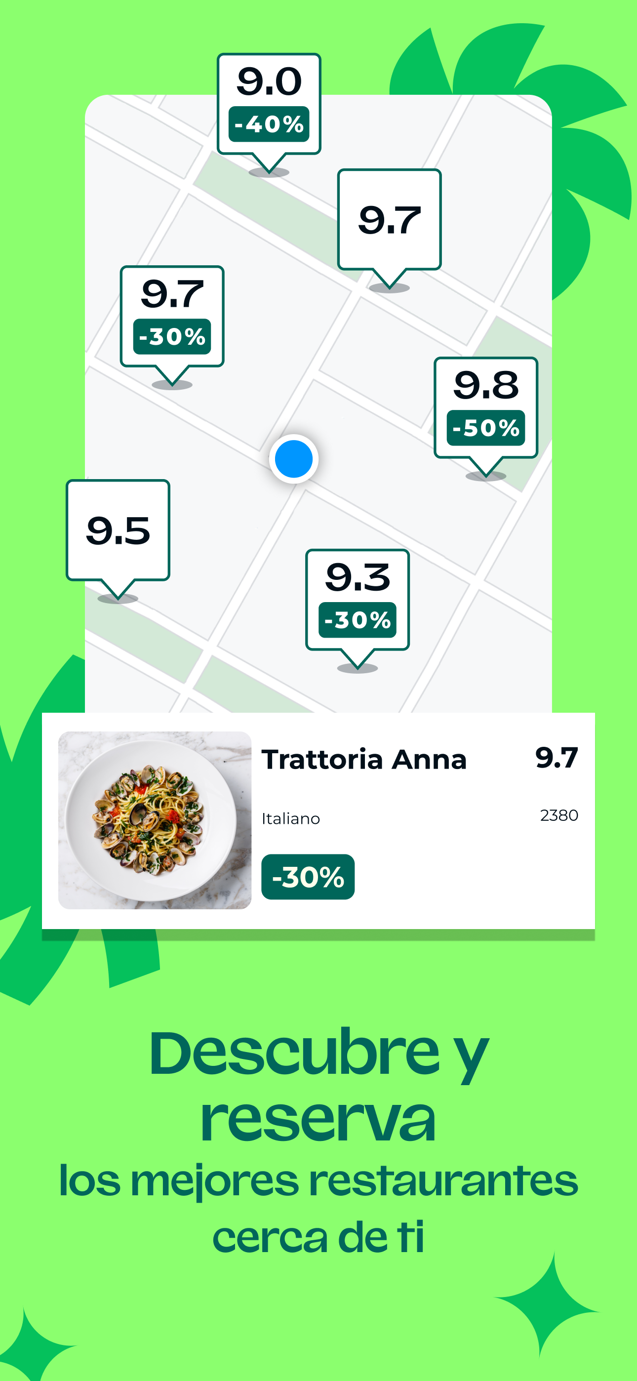 Nuestros restaurantes colaboradores son increíbles y miman a los usuarios tanto como nosotros, por lo que ofrecen ofertas exclusivas en reservas todo el año (aplicadas automáticamente, sujetas a las condiciones del momento de reserva). De esta forma, los restaurantes abren sus puertas a todos los comensales, siendo más accesibles para todos.