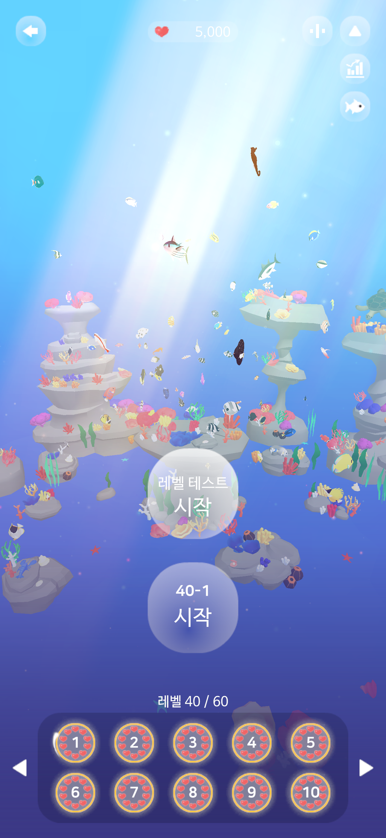 퀴즈를 풀면 보상으로 하트가 주어지는데 하트로 다양한 물고기를 구매해서 자신만의 수족관을 채워가는