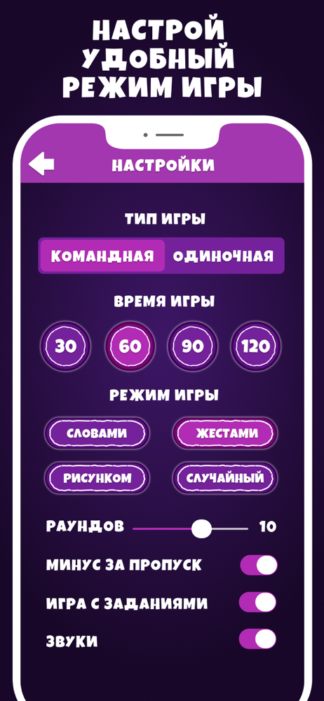 ► Настройте удобную для вас игру – установите время, количество раундов, задания, штрафы и другие параметры