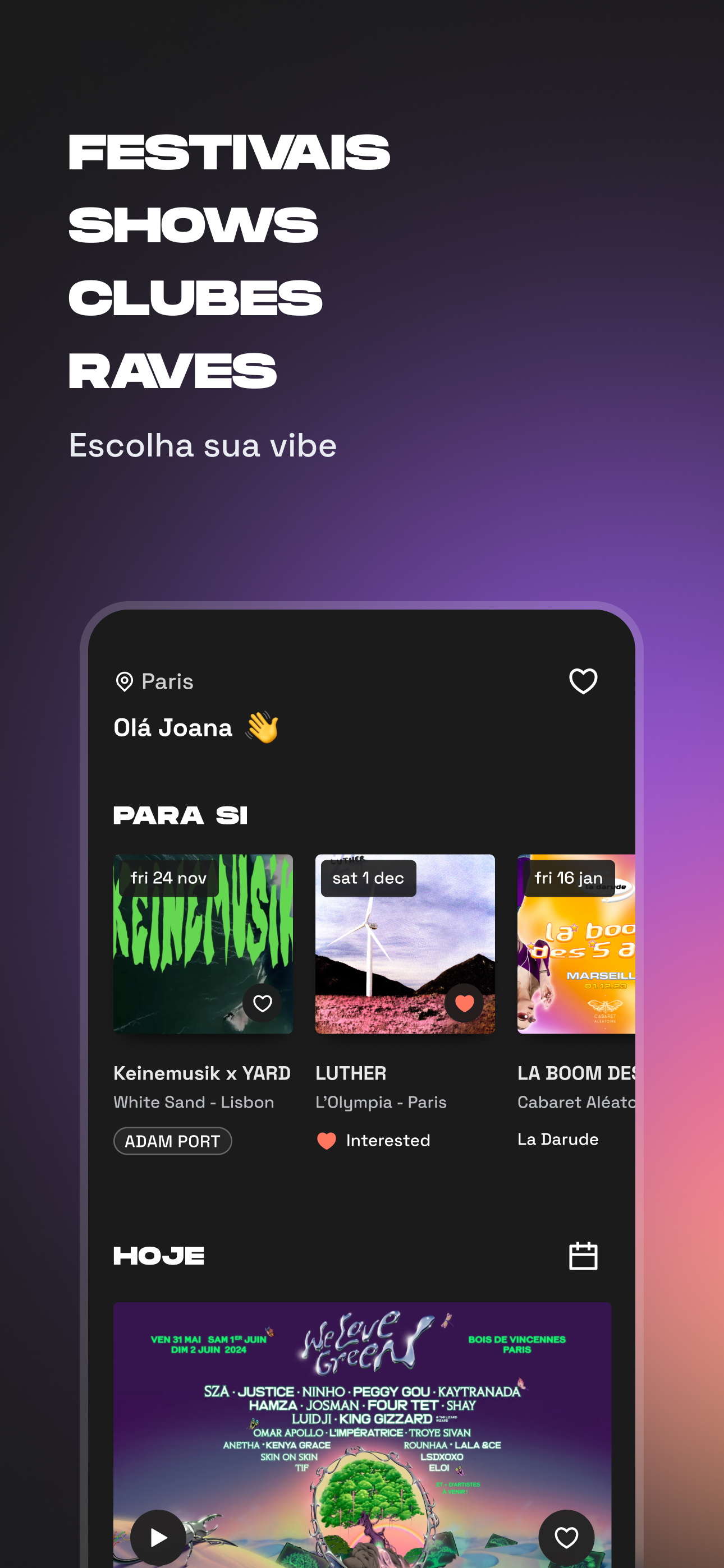 • Personalizado para Você: Receba alertas personalizados sincronizando com seus serviços de música, seguindo seus artistas ou produtores de eventos favoritos.